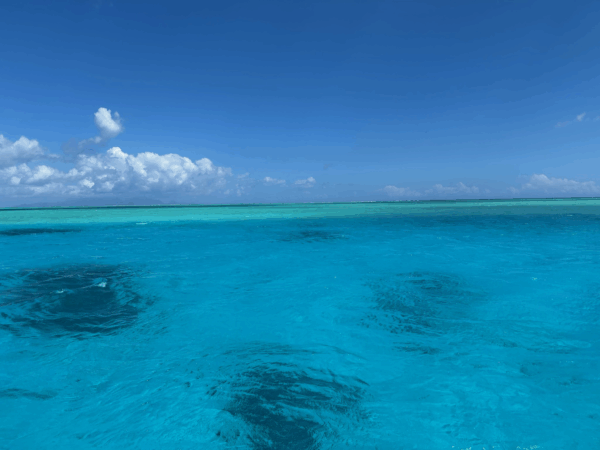ボラボラ島周辺の海は深さによって色が変化し、そのグラデーションが「太平洋の真珠」と呼ばれる所以だと改めて実感しました。深度によって生息する生き物も異なり、リーフシャークと泳いだり、深い場所を優雅に泳ぐマンタを見るなど、なかなかできない体験ができました。移動中にはガイドさんがウクレレを弾きながら歌ってくださり、さらに心地よさが増しました。